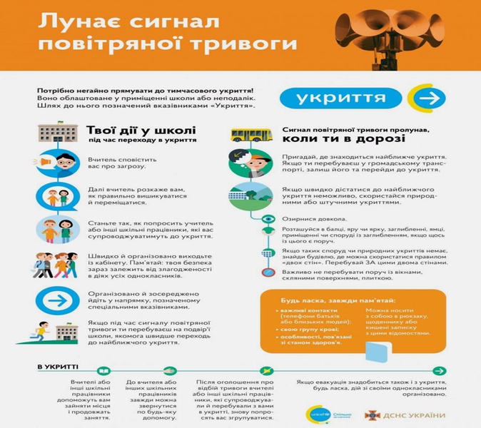 - Учні, які знаходяться на подвір'ї закладу, під час сигналу оповіщення повинні самостійно рухатися до найближчого укриття фонду захисних споруд.