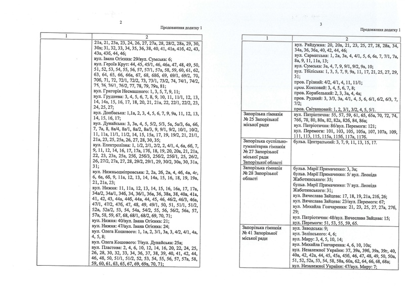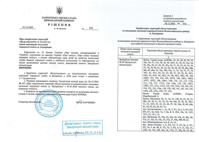 Згідно з РІШЕННЯМ виконавчого комітету Запорізької міської ради від 05.12.2025 №918 "Про закріплення території обслуговування за комунальними закладами загальної середньої освіти м. Запоріжжя" за Запорізької гімназією №20 Запорізької міської ради закріплено наступні території: